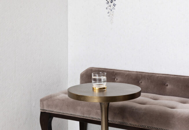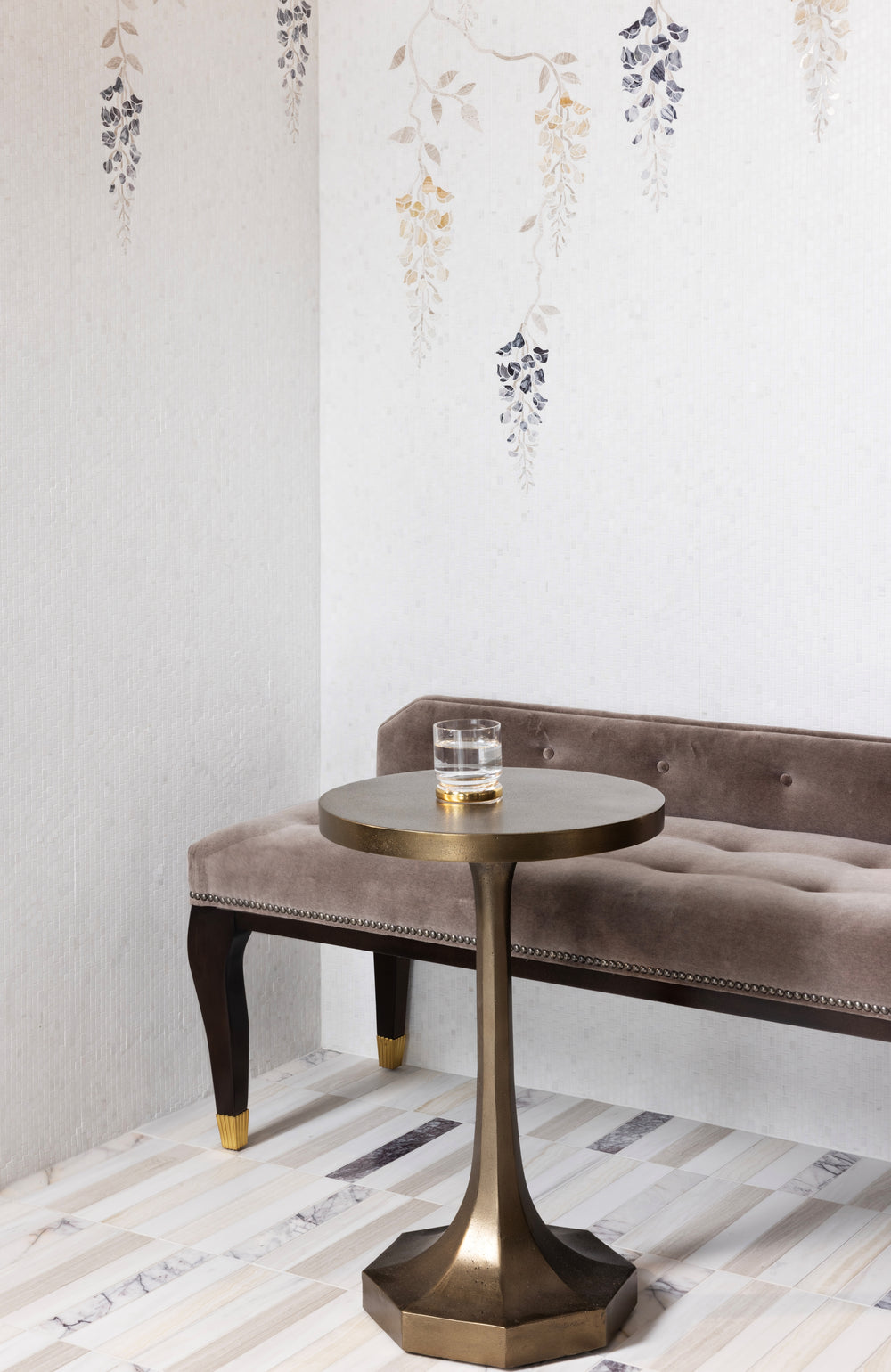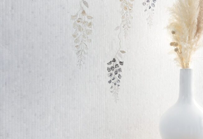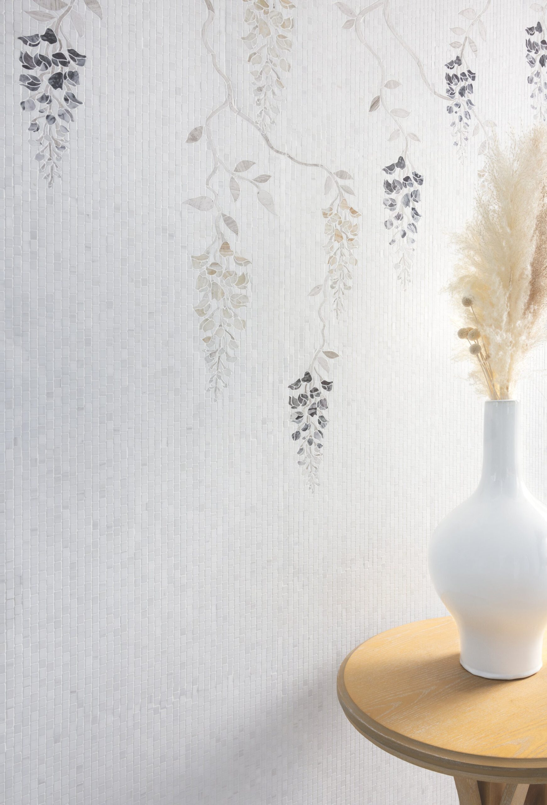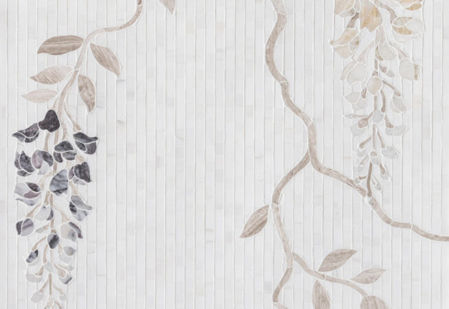 Designed as full-wall décor, Wisteria’s petals are crafted of polished Lilac marble and Vanilla Onyx, with vines of polished Cloud limestone on a ground of honed Bianco Dolomiti. Each segment of Wisteria comprises a full crate of interlocking sheets that total 49.67 square feet, covering an area of 9′ x 5.5′, and may be extended horizontally with additional full units.