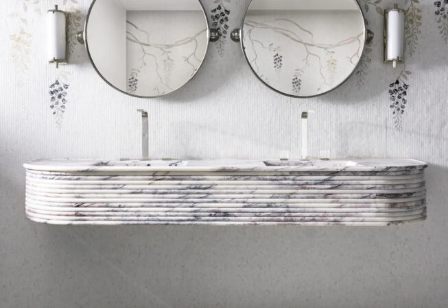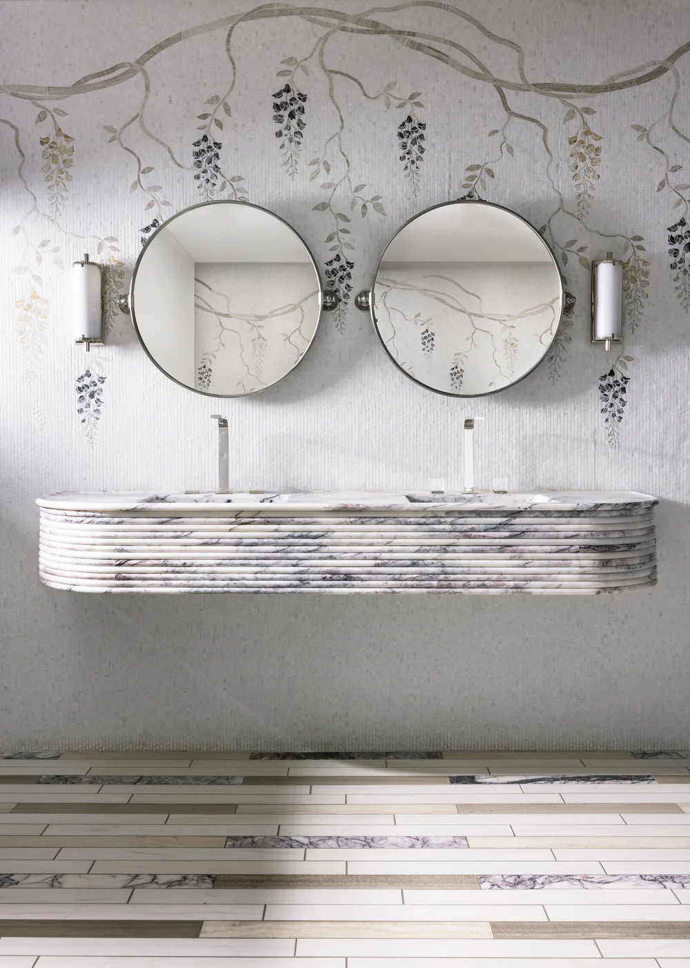 Exclusive to Artistic Tile, Wisteria Mosaic blends beautifully with fluted Lilac Marble slab vanity and custom geometric Domino Honed Mosaic floor.